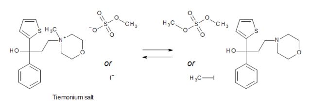 The out-of-patent quaternary ammonium anticonvulsive agent tiemonium is commercialised as the iodide and methyl sulfate salts, reflecting, presumably the synthetic processes for the drug substances. Consequently, if alcohols or ethers are used in the ultimate manufacturing steps, there is a known and obvious risk that the products may contain genotoxic impurities. Since these are old products, it is not clear whether manufacturers are required to search for and control these impurities. Furthermore, an interested scientist or other member of the public has no way of knowing whether the safety of these products has been assured.
